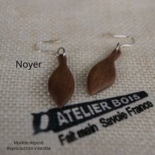 Brincos de madeira, esculpidos ou não em forma de gota de água, pena, folha, coração aberto, diamante, triângulo, borboleta, lua, onda em diferentes madeiras: cerejeira, nogueira, freixo, teixo, faia, carvalho, larício, bordo. Feita à mão por artesãos. Acabamento encerado.